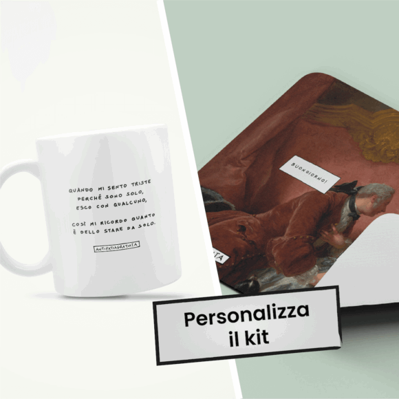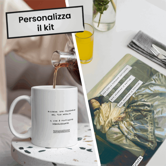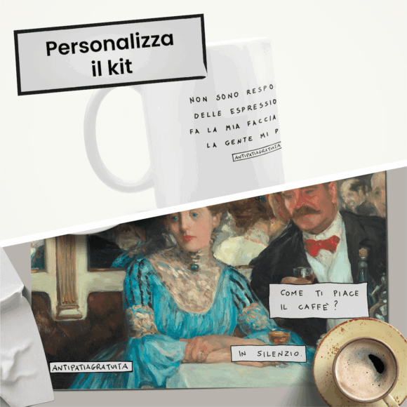 Ecco il Kit Antipatia a Colazione, il modo migliore per iniziare la mattina: scegli il meme che preferisci sia per la tazza che per la tovaglietta americana, perché sia chiaro a tutti che no, niente intaccherà il tuo buonumore. Perché non ne hai neanche un po’.