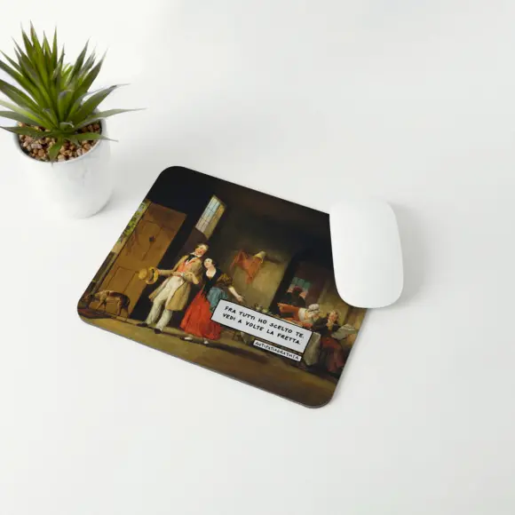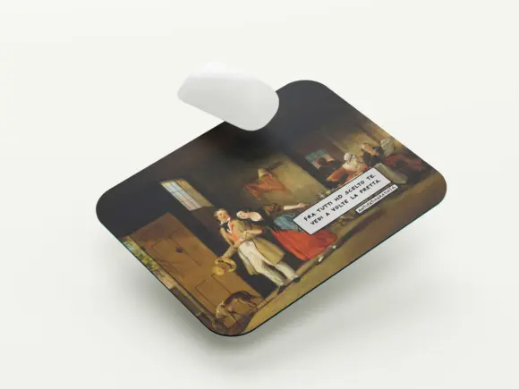 Tappetino mouse rettangolare in morbido e flessibile tessuto poliestere e fondo nero in gomma antiscivolo.